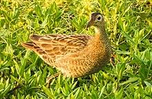 Female birds are smaller at 36 cm (14 in) and 298–434 g (10.5–15.3 oz).[3] They are dark brown above and paler below. the plumage is streaked and barred with darker markings. The bill is yellow and the legs are green. The downy chicks are black, as with all rails.