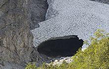 Amongst the other permanent snow and icefields the Eiskapelle ("Ice Chapel") is the best known due to its easy accessibility from St. Bartholomä. The Eiskapelle may well be the lowest lying permanent snowfield in the Alps. Its lower end is only 930 metres high in the upper Eisbach valley and is about an hour's walk from St. Bartholomä on the Königssee. The Eiskapelle is fed by mighty avalanches that slide down from the east face of the Watzmann in spring and accumulate in the angle of the rock face. Sometimes a gate-shaped vault forms in the ice at the point where the Eisbach emerges from the Eiskapelle. Before entering there is an urgent warning sign that others have been killed by falling ice.