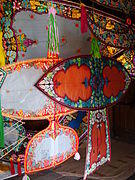 Wau bulan (Jawi: واو بولن) is an intricately designed Malaysian moon-kite (normally with floral motifs) that is traditionally flown in the Malaysian state of Kelantan. It is one of Malaysia's national symbols, some others being the hibiscus. The reverse side of the fifty-cent coin of Malaysia (1989 series) features an intricately decorated wau bulan with a hummer on top.[1] The logo of Malaysia Airlines (MAS) is based on the wau kucing (cat kite).