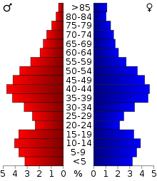 The age distribution was 24.1% under the age of 18, 6.8% from 18 to 24, 23.6% from 25 to 44, 31.2% from 45 to 64, and 14.3% 65 or older. The median age was 42 years. For every 100 females there were 96.30 males. For every 100 females age 18 and over, there were 93.90 males.