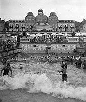 Another early public wave pool was designed and built in 1927[4] in Budapest, Hungary in the known Gellért Baths, and appeared one of James A. Fitzpatrick's documentary Traveltalks films about the city in 1938, as one of the main tourist attractions.[5] It remains open.
