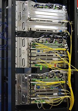 The introduction of the ITU-T G.694.1[7] frequency grid in 2002 has made it easier to integrate WDM with older but more standard SONET/SDH systems. WDM wavelengths are positioned in a grid having exactly 100 GHz (about 0.8 nm) spacing in optical frequency, with a reference frequency fixed at 193.10 THz (1,552.52 nm).[8] The main grid is placed inside the optical fiber amplifier bandwidth, but can be extended to wider bandwidths. The first commercial deployment of DWDM was made by Ciena Corporation on the Sprint network in June 1996.[9][10][11] Today's DWDM systems use 50 GHz or even 25 GHz channel spacing for up to 160 channel operation.[12]