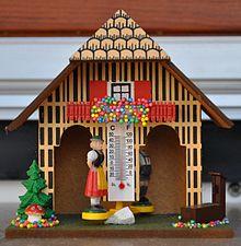 In fact, a weather house functions as a hygrometer embellished by folk art. The male and female figures ride on a balance bar, which is suspended by a piece of catgut or hair. The gut relaxes or shrinks based on the humidity in the surrounding air, relaxing when the air is wet and tensing when the air is dry. This action swings one figure or the other out of the house depending on the humidity.[1] Some variants function as a barometer: low pressure indicates wrong (rainy) weather, high pressure good (sunny) weather.