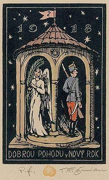 A weather house is depicted on this New Year's Day greeting card by the Czech artist Tavik Frantisek Simon.