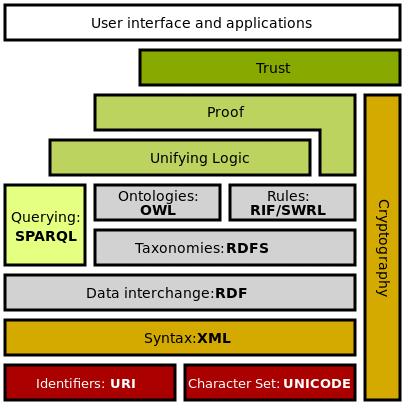 The Semantic Web Stack illustrates the architecture of the Semantic Web. The functions and relationships of the components can be summarized as follows:[24]