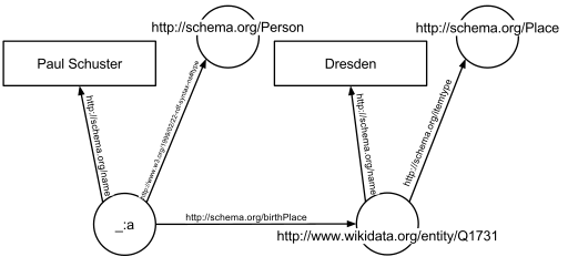 _:a <https://www.w3.org/1999/02/22-rdf-syntax-ns#type> <https://schema.org/Person> . _:a <https://schema.org/name> "Paul Schuster" . _:a <https://schema.org/birthPlace> <https://www.wikidata.org/entity/Q1731> . <https://www.wikidata.org/entity/Q1731> <https://schema.org/itemtype> <https://schema.org/Place> . <https://www.wikidata.org/entity/Q1731> <https://schema.org/name> "Dresden" .