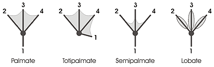 - Totipalmate: all four digits (1–4) are joined by webbing. Found in gannets and boobies, pelicans, cormorants, anhingas and frigatebirds. Some gannets have brightly colored feet used in display.[14][16]