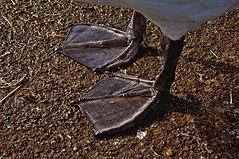A webbed foot has connecting tissue between the toes of the foot. Several distinct conditions can give rise to webbed feet, including interdigital webbing and syndactyly. The webbing can consist of membrane, skin, or other connective tissue and varies widely in different taxa. This modification significantly increases the surface area of the feet. One of the consequences of this modification in some species, specifically birds, is that the feet are a major location for heat loss.[3] In birds, the legs utilize countercurrent heat exchange so that blood reaching the feet is already cooled by blood returning to the heart to minimize this effect.[4][5] Webbed feet take on a variety of different shapes; in birds, the webbing can even be discontinuous, as seen in lobate-footed birds like grebes.[6] However, one of the most common is the delta (Δ) or triangular shape seen in most waterfowl and frogs.[1] This delta wing shape is a solution that has convergently evolved in many taxa, and is also used in aircraft to allow for high lift forces at high attack angles. This shape allows for the production of large forces during swimming through both drag-based and lift-based propulsion.[1]