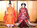 Traditional Japanese wedding robes worn by the Crown Prince of Japan, Akihito and Michiko Shoda for their marriage, 1959.