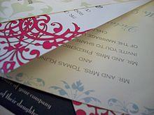 Etiquette regarding the text on a formal wedding invitation varies according to country, culture and language. In Western countries, a formal invitation is typically written in the formal, third-person language, saying that the hosts wish for the recipient to attend the wedding and giving its date, time, and place. Even in countries like India, where the concept of wedding invitations was acquired through the British, the language continues to follow western traditions.[3]