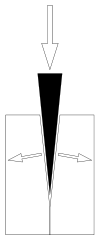 Wedges, saws and chisels can separate thick and hard materials, such as wood, solid stone and hard metals and they do so with much less force, waste of material, and with more precision, than crushing, which is the application of the same force over a wider area of the material to be separated.