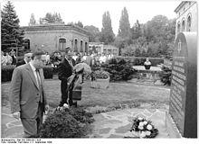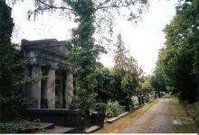 The plot of land was bought by the Jewish community of Berlin, comprising - besides congregants of orthodox and reform affiliation - mostly observants of mainstream Judaism (in today's term described at best as conservative Judaism).[2] The old Jewish cemetery in Große Hamburger Straße, opened 1672, had reached its full capacity in 1827.[3] The second cemetery in Schönhauser Allee, opened in the same year, reached its capacity in the 1880s, offering only few remaining gravesites in family ensembles mostly reserved for widows and widowers next to their earlier deceased spouses.[4] Weißensee Cemetery was designed by renowned German architect Hugo Licht in the Italian Neorenaissance style. It was inaugurated in 1880.[5] The surrounding walls and main building (where the archives are kept and the cemetery is administered) were constructed with a distinctive yellow brick. A second building (built in 1910) was destroyed during World War II.