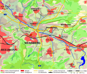 - ^ Further source for the town structure section: Das Land Baden-Württemberg. Amtliche Beschreibung nach Kreisen und Gemeinden. Volume IV: Regierungsbezirk Stuttgart, Regionalverbände Franken und Ostwürttemberg. Kohlhammer, Stuttgart 1980, ISBN 3-17-005708-1. p. 142–146; Dumitrache/Haag: Archäologischer Stadtkataster Weinsberg (view literature). p. 16ff.