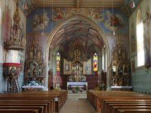 • St. Pelagius Church; the neo-Gothic church of the town of Weitnau. Reconstructed in part 1862-72. In all probability only the nave was reconstructed, the choir, which was built in 1739-1740, was very likely retained. Parts of the spire date back to the 14th century. The church is considered a neo-Gothic sacred building, it features numerous elaborate stencil drawings and colourful embellishments. The statues of the high altar originate from the Multscher School and date back to around 1490. Station of the Jakobus Pilgrimage Trail