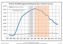 Development of population since 1875 within the current Boundaries (Blue Line: Population; Dotted Line: Comparison to Population development in Brandenburg state; Grey Background: Time of Nazi Germany; Red Background: Time of communist East Germany)