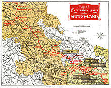 From 1915 the MR began a programme of selling off its surplus land holdings in Buckinghamshire, Hertfordshire and Middlesex for suburban housing development. Its Metropolitan Railway Country Estates Limited marketed areas such as Wembley Park under the "Metro-land" brand, promoting modern homes in beautiful countryside with a fast railway service to central London.[12] The MR sold the park land at Wembley when the site was selected to host the 1924 British Empire Exhibition and the grand British Empire Exhibition Stadium constructed for this event was later to become Wembley Stadium, the home ground of the England national football team.[13]