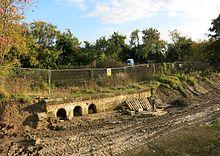 Phase 2 involves a 1.75-mile (2.8 km) dry section from Little Tring to Drayton Beauchamp (51°47′56″N 0°41′29″W / 51.799°N 0.6915°W), and includes the navigable culvert under the Aston Clinton bypass.[39] Original plans drawn up in the late 1990s for converting the A41 to a dual carriageway and bypassing Aston Clinton included a low level crossing of the canal, which would have prevented restoration. However, negotiations resulted in the Highways Authority funding a diversion of the canal to a point where there was sufficient headroom for navigation. The Trust argued that an 18-inch (460 mm) pipe to carry away rain water from the road would be insufficient in storm conditions, and that excavating 630 yards (580 m) of new canal would be a better solution. The old route of the canal has become a reed bed, acting as a settling pond for water from the road, before it joins the new channel.[41] British Waterways funded restoration of a further 120 yards (110 m) through Drayton Beauchamp bridge, where repairs to the feeder pipeline which runs along the bottom of the canal were needed to prevent flooding in the village. The pipeline will not be needed once the work is completed. However it will remain in place under the canal, and is having to be capped with concrete to prevent the restored canal collapsing into it. As work proceeds, the channel is being re-profiled, and then lined with Bentomat liner, which consists of a layer of Bentonite clay sandwiched between two layers of geotextile. Concrete blocks have been laid over the liner on the side walls of the channel, with turf above water level. As each new section is re-profiled, the spoil removed is used to cover the bed of the canal on the previous section to a depth of 1 foot (300 mm).[42][43]