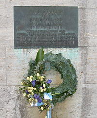 On the same day, Haeften, along with Stauffenberg and fellow conspirators General Friedrich Olbricht and Oberst Albrecht Mertz von Quirnheim, was arrested after a summary court martial and sentenced to death by General Friedrich Fromm, who was himself later arrested and executed by the Nazi regime for his tacit complicity. All four plotters were shot after midnight by a ten-man firing squad from the Grossdeutschland Guards Battalion in the courtyard of the War Ministry, the Bendlerblock.[2] When Stauffenberg was about to be shot, in a last gesture of loyalty and defiance, Haeften placed himself in the path of the bullets meant for Stauffenberg.[3]