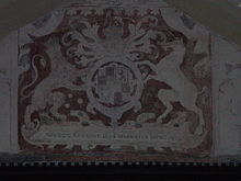 Later on, to remind all the villagers who was king, King James I had his royal coat of arms painted in the Church. This coat of arms can still be seen to this day if one stands in the gallery and looks towards the altar. The motto on the arms reads "Exurgat Deus Dissipenter Ininice", this is the opening line of Psalm 68[42] (Let God arise and let His enemies be scattered). Opposite James's arms is a set of Hanoverian arms acquired in 1816.[43]
