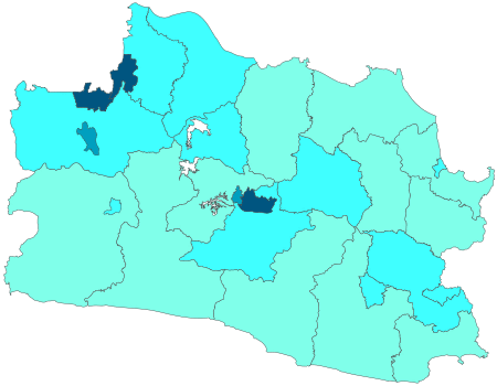 Since the creation of West Bandung Regency in 2008,[10] the Province of West Java has been subdivided into 9 cities (Indonesian: Kota) and 17 regencies (Indonesian: Kabupaten). These 26 cities and regencies are divided into 620 districts (Indonesian: Kecamatan), which comprise 1,576 urban villages (Indonesian: Kelurahan) and 4,301 rural villages (Indonesian: Desa).[10] An 18th regency was formed in October 2012 – Pangandaran Regency – from the southern half of Ciamis Regency. On 25 October 2013, the Indonesian House of Representatives (DPR) began reviewing draft laws on the establishment of 57 prospective regencies (and eight new provinces),[11] including a further three regencies in West Java – South Garut (Garut Selatan), North Sukabumi (Sukabumi Utara) and West Bogor (Bogor Barat) – but none of these three new regencies are shown separately on the map below, nor in the following table.