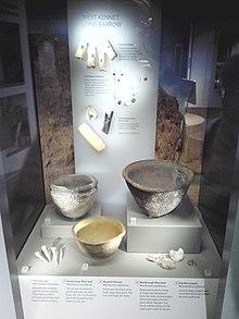 It is probable that the site on which West Kennet Long Barrow was built had been used for older human activity.[20] This is probably demonstrated by the presence of sherds of a plain bowl that excavators found in buried soil beneath the monument during the 1950s.[20] The architectural style of the Long Barrow, coupled with the style of the primary interments of human remains, led archaeologists who excavated in the 1950s to believe that it was Early Neolithic in date.[21] A nearby monument, the Windmill Hill causewayed enclosure, revealed three radiocarbon dates which demonstrated that it was Early Neolithic, leading archaeologists to consider an Early Neolithic date for the Long Barrow to also be probable.[21]