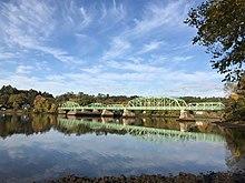 West Newbury is a part of Massachusetts' North Shore, as well as the Merrimack Valley regions of the state. It lies along the south banks of the Merrimack River, 10 miles (16 km) upstream from the Atlantic Ocean. The town is located approximately 13 miles (21 km) northeast of Lawrence and 34 miles (55 km) north of Boston. It is bordered by Merrimac and Amesbury to the north, Newburyport to the east, Newbury to the southeast, Groveland to the southwest, and Haverhill to the west. The Rocks Village Bridge across the Merrimack River is the only access to the northern banks of the river in town; there is no direct route into Merrimac and Amesbury.