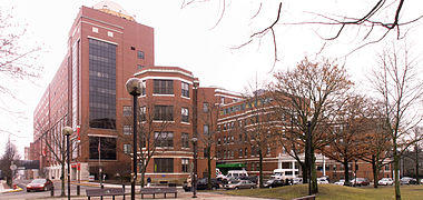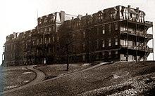 The hospital was officially chartered in 1882 and on Feb. 15, 1886, the forerunner to Allegheny General Hospital opened its doors.[11] In 1887, the hospital established a children's wing, and in 1889, an ambulance was donated to the hospital; AGH would operate its own ambulance service for the next 64 years. A hospital annex was opened in June 1892, giving AGH additional surgical space. At the turn of the century, the hospital's directors began collecting funds for a new AGH, to be built just a block away, also along Stockton Avenue. The seven-story, 400-bed facility cost $620,000, and opened in 1904.[11] The new space included more modern laboratory facilities: separate rooms for urinalysis, blood work, bacteriology, and autopsies. Within the decade, the hospital's board president, Dr. Maitland Alexander, convinced the kin of steel magnate William H. Singer to build a new, three-story research laboratory behind the hospital, which opened in 1916 and would later be known as the Singer Research Institute[12] (now called the AHN Research Institute[13]). Like many hospitals of that era, AGH distinguished itself during wartime; AGH was among the first medical institutions in the country to offer its services to the U.S. Department of War during WWI, and in 1918, the AGH Red Cross Unit made its way from Pittsburgh to Bourbonne-les-Bains, France, where a complement of AGH employees manned a French military hospital.[11]