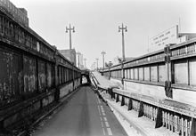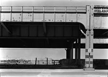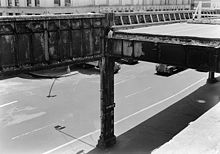 Built between 1929 and 1951, the highway had narrow confines—which could not accommodate trucks—and sharp S exit ramps that made it obsolete almost immediately. Maintenance was minimal, and the use of corrosive salts to de-ice the highway in winter accelerated its decay. When chunks of its facade began to fall off due to lack of maintenance, and a truck and car fell through it at 14th Street in 1973, the highway was shut down, and a debate began whether to renovate it or dismantle it.[1] Attitudes to urban planning had changed in the intervening decades, and the decision was made not to repair the decaying structure.