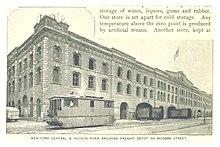 In 1867 the New York Central Railroad and Hudson River Railroad were united by Cornelius Vanderbilt, being merged in 1869 to form the New York Central and Hudson River Railroad. The railroad acquired the former Episcopal church's St. John's Park property and built a large freight depot at Beach and Varick streets which opened in 1868. The tracks south to Chambers Street were then removed.[4] In 1871, the Spuyten Duyvil and Port Morris Railroad (Hudson Line) opened, and most passenger trains were rerouted into the new Grand Central Depot via that line along the northeast bank of the Harlem River and the New York and Harlem Railroad (Harlem Line), also part of the New York Central system. The old line south of Spuyten Duyvil remained for freight to the docks along Manhattan's west side and minimal passenger service to the West Side station on Chambers Street (used until 1916).