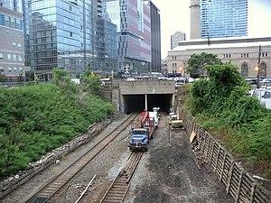 When the West Side Yard for the Long Island Rail Road was built on the west side of Manhattan in 1986, a tunnel was built under it connecting Penn Station to the West Side Line just west of Eleventh Avenue, near the Javits Center. The project severed the southernmost part of the West Side Line, the High Line viaduct, from the rest of the West Side Line.[18] When additional funding later became available, one track along the northern part of the West Side Line was rebuilt for passenger service and named the Empire Connection. A short section of single track into Penn Station was electrified using third rail and overhead catenary, since diesel locomotives are not allowed in Penn Station's tunnels. North of 41st Street, the single track expands into two tracks and electrification on the line ends. A wye was constructed next to Track 2 (the westernmost track) to allow diesels to turn around. South of 49th Street, there is a crossover from Track 1 (the easternmost track) to Track 2, and another siding splits off Track 2 at 49th Street. The Empire Connection was double-tracked north of 39th Street to south of the Spuyten Duyvil Bridge in the mid-1990s.