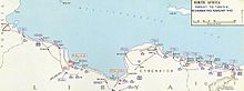 In 1940, British military forces had a base at the terminus of the Egyptian state railway, road and the port of Mersa Matruh (Matruh) 200 mi (320 km) west of Alexandria. Construction began on a water pipeline along the railway and the British surveyed sources of water. Wells were dug but most filled with salt water; in 1939 the primary fresh water sources were the Roman aqueducts at Mersa Matruh and Maaten Baggush. Water-boats from Alexandria and a distillation plant at Matruh increased supply but rigorous rationing had to be enforced and much water had to be moved overland to outlying areas. Not enough vehicles were available in 1939 and lorries were diverted to provide the Armoured Division with a better rear link. Only desert-worthy vehicles could be risked cross-country, which left tanks unable to move far from Matruh which was 120 mi (190 km) east of the Libyan border.[15] From the border there was no water at Sollum or for another 50 mi (80 km) east of Sollum to Sidi Barrani, along a very poor road. An invader would have to move through a waterless and trackless desert to reach the main British force.[16] In September 1940, the New Zealand Railway Battalion and Indian labourers began work on a coastal railway, which reached Sidi Barrani by October 1941 and Tobruk by December 1942, 400 mi (640 km) west of El Alamein, carrying 4,200 long tons (4,267 t) of water per day.[17]