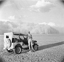 Bedouin tracks linked wells and the more easily traversed ground; navigation was by sun, star, compass and "desert sense", good perception of the environment gained by experience. When Italian troops advanced into Egypt in September 1940, the Maletti Group got lost leaving Sidi Omar, disappeared and had to be found by aircraft. In spring and summer the days are miserably hot and the nights very cold.[8] The Sirocco (Gibleh or Ghibli), a hot desert wind, blows clouds of fine sand, which reduce visibility to a few metres and coat eyes, lungs, machinery, food and equipment; motor vehicles and aircraft need special oil filters and the barren terrain means that supplies for military operations have to be transported from outside.[9] German engines tended to overheat and the life of their tanks' engines fell from 1,400–1,600 mi (2,300–2,600 km) to 300–900 mi (480–1,450 km) and this problem was made worse by the lack of standardized spare parts for the German and Italian motor types.[10]