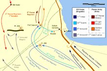 Operation Brevity (15–16 May) was a limited offensive, to inflict attrition on Axis forces and secure positions for a general offensive towards Tobruk. The British attacked with a small tank-infantry force in three columns, Desert, Centre and Coast. Desert Column, with British cruiser tanks, was to advance inland and destroy tanks found en route to Sidi Aziz. Centre Column was to capture the top of the Halfaya Pass, Bir Wair and Musaid, then press on to Fort Capuzzo. Coast Column was to take Sollum and the foot of Halfaya Pass. Sollum, Halfaya Pass and Fort Capuzzo were captured but then the fort was lost to a counter-attack. A German counter-attack on 16 May threatened the force at the top of the pass and a retreat was ordered, covered by Desert Column. The Germans took Musaid back and a general British retreat began, to a line from Sidi Omar to Sidi Suleiman and Sollum, which left only the Halfaya Pass in British hands.[45] Brevity failed to achieve most of its objectives and only briefly held the Halfaya Pass. The British lost 206 casualties. Five tanks were destroyed and 13 damaged. German casualties were 258 men, three tanks destroyed and several damaged. Italian casualties were 395, of whom 347 were captured.[46] On 12 May, the Tiger convoy lost one ship and arrived in Alexandria, with 238 tanks, to re-equip the 7th Armoured Division and 43 aircraft. On 28 May, planning began for Operation Battleaxe.[47]