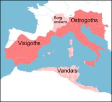 After the fall of the Western Roman Empire, the Germanic kingdoms, often referred to as "barbarian kingdoms", founded during its collapse continued to grow and prosper. Their beginnings, together with the end of the Western Roman Empire, mark the transition from Late Antiquity to the Middle Ages. The practices of the barbarian kingdoms gradually replaced the old Roman institutions, specifically in the praetorian prefectures of Gaul and Italy, during the sixth and seventh centuries.[92] In many places, the Roman institutions collapsed along with the economic stability. In some regions, notably Gaul and Italy, the settlement of barbarians on former Roman lands seems to have caused relatively little disruption, with barbarian rulers using and modifying the Roman systems already in place.[93] The Germanic kingdoms in Italy, Hispania and Gaul continued to recognise the Emperor in Constantinople as a somewhat nominal sovereign, the Visigoths minted coins in their names until the reign of Justinian I in the sixth century.[94]