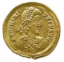 Honorius, the younger son of Theodosius I, was declared Augustus (and as such co-emperor with his father) on 23 January in 393. Upon the death of Theodosius, Honorius inherited the throne of the West at the age of ten whilst his older brother Arcadius inherited the East. The western capital was initially Mediolanum, as it had been during previous divisions, but it was moved to Ravenna in 402 upon the entry of the Visigothic king Alaric I into Italy. Ravenna, protected by abundant marshes and strong fortifications, was far easier to defend and had easy access to the imperial fleet of the Eastern Empire but made it more difficult for the Roman military to defend the central parts of Italy from regular barbarian incursions.[51] Ravenna would remain the western capital for 74 years until the deposition of Romulus Augustulus and would later be the capital of both the Ostrogothic Kingdom and the Exarchate of Ravenna.[52][53]