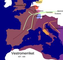 The Western Roman Empire in 418 AD, following the abandonment of Britannia and the settlement of the Visigoths, Burgundians and Suebi within imperial territory as foederati | |||||||||||||||||||||||||||||||
