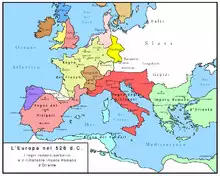 Though acting as a subordinate in domestic affairs, Theodoric acted increasingly independent in his foreign policies. Seeking to counterbalance the influence of the Empire in the East, Theoderic married his daughters to the Visigothic king Alaric II and the Burgundian prince Sigismund. His sister Amalfrida was married to the Vandal king Thrasamund and he married Audofleda, sister of the Frankish king Clovis I, himself.[107] Through these alliances and occasional conflicts, the territory controlled by Theoderic in the early sixth century nearly constituted a restored Western Roman Empire. Ruler of Italy since 493, Theoderic became king of the Visigoths in 511 and exerted hegemony over the Vandals in North Africa between 521 and 523. As such, his rule extended throughout the western Mediterranean. The Western imperial regalia, housed in Constantinople since the deposition of Romulus Augustulus in 476, were returned to Ravenna by Emperor Anastasius in 497.[108] Theoderic, by now Western Emperor in all but name, could not, however, assume an imperial title, not only because the notion of a separate Western court had been abolished but also due to his "barbarian" heritage, which, like that of Ricimer before him, would have barred him from assuming the throne.[78]
