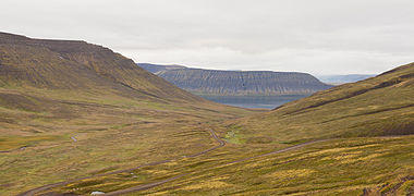 The Westfjords or West Fjords (Icelandic: Vestfirðir, ISO 3166-2:IS: IS-4) is a large peninsula in northwestern Iceland and an administrative district. It lies on the Denmark Strait, facing the east coast of Greenland. It is connected to the rest of Iceland by a 7-km-wide isthmus between Gilsfjörður and Bitrufjörður. The Westfjords are very mountainous; the coastline is heavily indented by dozens of fjords surrounded by steep hills. These indentations make roads very circuitous and communications by land difficult. In addition many of the roads are closed by ice and snow for several months of the year. The Vestfjarðagöng road tunnel from 1996 has improved that situation. The cliffs at Látrabjarg comprise the longest bird cliff in the northern Atlantic Ocean and are at the westernmost point in Iceland. The Drangajökull glacier is located in the north of the peninsula and is the fifth-largest of the country, but the only glacier of the region.