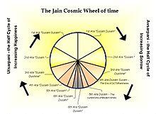 Within Jainism, time is thought to be a wheel which rotates for infinity without a beginning. This wheel of time holds twelve spokes that each symbolize a different phase in the universe's cosmological history. It is further divided into two equal halves having six eras in them. While in downward motion, the wheel of time falls into what is known as Avasarpiṇī and when in upward motion, enters a state called Utsarpini. During both motions of the wheel, 24 tirthankaras come forth to teach the three jewels or sacred Jain teachings of right faith, right knowledge and right practice, then create a spiritual ford across the ocean of rebirth for humanity.[2][3]