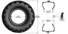 Off-roading tires may use a different measurement scheme: outside diameter x tread width, followed by wheel size (all in inches) – for example 31x10.50R15 (787 mm × 267 mm R380 in metric designation). The size of the wheel, however, is denoted as 8.5 in × 20.0 in (220 mm × 510 mm). This means that the width of the wheel is 8.5 in (220 mm) and the diameter is 20 in (510 mm).