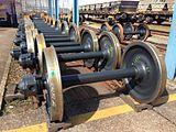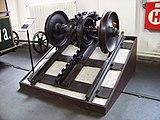 Two wheelsets with journal boxes in a North American (Bettendorf-style) freight bogie displayed at the Illinois Railway Museum.