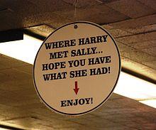 In a scene featuring the two title characters having lunch at Katz's Delicatessen in Manhattan, the couple are arguing about a man's ability to recognize when a woman is faking an orgasm. Sally claims that men cannot tell the difference, and to prove her point, she vividly (fully clothed) fakes one as other diners watch. The scene ends with Sally casually returning to her meal as a nearby patron (played by Reiner's mother) places her order, deadpan: "I'll have what she's having." When Estelle Reiner died at age 94 in 2008, The New York Times referred to her as the woman "who delivered one of the most memorably funny lines in movie history".[9] This scene was shot again and again, and Ryan demonstrated her fake orgasms for hours.[7] Katz's Deli still hangs a sign above the table that says, "Where Harry met Sally... hope you have what she had!"[10][11]