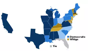Clay and Van Buren, the two front-runners for major-party presidential nominations in the 1844 election, both announced their opposition to annexation, and the Senate blocked the annexation treaty.[65] To the surprise of Clay and other Whigs, the 1844 Democratic National Convention rejected Van Buren in favor of James K. Polk and established a platform calling for the acquisition of both Texas and Oregon Country.[66] Having won the presidential nomination at the 1844 Whig National Convention unopposed, Clay and other Whigs were initially confident that they would defeat the divided Democrats and their relatively obscure candidate.[67] However, Southern voters responded to Polk's calls for annexation, while in the North, Democrats benefited from the growing animosity towards the Whig Party among Catholic and foreign-born voters.[68] Ultimately, Polk won the election, taking 49.5% of the popular vote and a majority of the electoral vote; the swing of just over one percent of the vote in New York would have given Clay the victory.[69]
