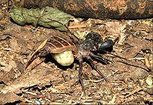Whip scorpions are found in tropical and subtropical areas excluding Europe and Australia. Also, only a single species is known from Africa: Etienneus africanus, probably a Gondwana relict endemic to Senegal, the Gambia and Guinea-Bissau.[13] They usually dig burrows with their pedipalps, to which they transport their prey.[10] They may also burrow under logs, rotting wood, rocks, and other natural debris. They prefer humid, dark places and avoid light. Mastigoproctus giganteus, the giant whip scorpion, is found in more arid areas, including Arizona and New Mexico.[14]