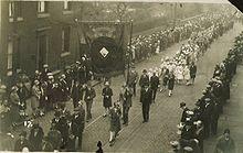 The origin of the whit week processions of "Sunday school scholars" (which are still held to this day) dates back to 19 July 1821 when there was a procession of the children of Manchester to commemorate the coronation of George IV. On that day children of all denominations walked in procession from their schools and assembled at Ardwick Green to sing "God Save the King". From then on the annual festival flourished and, in the course of time, St Ann's Square became the assembly ground. The numbers continued to grow and this was moved to Albert Square in 1878.[4] Each Whit Friday, local churches or chapels in the region employed bands to lead traditional processions through the streets. Whit Friday was the "Scholars' Walk", or the Church's Annual Day when the girls would have a new dress and the boys would have new trousers, and neighbours, friends and relatives would give a penny for their new clothes. The church officers, clergy and children carried baskets of flowers or ribbons attached to banners.[5]