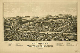 The village has long had a role in transportation, primarily as a railroad junction. From the arrival of the first railroads in the late 1840s until rail diminished in importance in the 1960s due to the Interstate Highway System, White River Junction was the most important railroad community in Vermont.[6] Its original importance was due to its location at the confluence of the White River with the Connecticut River. In 1803 Elias Lyman built a bridge across the Connecticut from the north bank of the White River to West Lebanon, New Hampshire.[4]