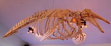 The fossil record also indicates that, in comparatively recent times, the beluga's range varied with that of the polar ice packs expanding during ice ages and contracting when the ice retreated.[23] Counter-evidence to this theory comes from the finding in 1849 of fossilised beluga bones in Vermont in the United States, 240 km (150 mi) from the Atlantic Ocean. The bones were discovered during construction of the first railroad between Rutland and Burlington in Vermont, when workers unearthed the bones of a mysterious animal in Charlotte. Buried nearly 10 ft (3.0 m) below the surface in a thick blue clay, these bones were unlike those of any animal previously discovered in Vermont. Experts identified the bones as those of a beluga. Because Charlotte is over 150 mi (240 km) from the nearest ocean, early naturalists were at a loss to explain the presence of the bones of a marine mammal buried beneath the fields of rural Vermont.