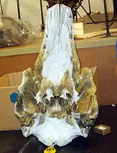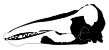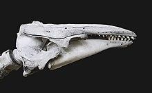 The beluga's earliest known distinctive ancestors include the prehistoric Denebola brachycephala from the late Miocene epoch (9–10 million years ago),[18][19] and Bohaskaia monodontoides, from the early Pliocene (3–5 million years ago).[20] Fossil evidence from Baja California[21] and Virginia indicate the family once inhabited warmer waters.[20] A fossil of the monodontid Casatia thermophila, from five million years ago, provides the strongest evidence that monodontids once inhabited warmer waters, as the fossil was found alongside fossils of tropical species such as bull and tiger sharks.[22]
