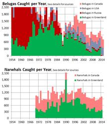 Hunters in Hudson's Bay rarely eat the meat. They give a little to dogs, and leave the rest for wild animals.[142] Other areas may dry the meat for later consumption by humans. In Greenland the skin (muktuk) is sold commercially to fish factories,[143] and in Canada to other communities.[142] An average of one or two vertebrae and one or two teeth per beluga are carved and sold.[142] One estimate of the annual gross value received from Beluga hunts in Hudson Bay in 2013 was CA$600,000 for 190 belugas, or CA$3,000 per beluga. However, the net income, after subtracting costs in time and equipment, was a loss of CA$60 per person. Hunts receive subsidies, but they continue as a tradition, rather than for the money, and the economic analysis noted that whale watching may be an alternate revenue source. Of the gross income, CA$550,000 was for skin and meat, to replace beef, pork and chickens which would otherwise be bought. CA$50,000 was received for carved vertebrae and teeth.[142]