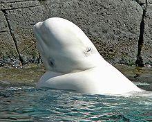 The whale is also colloquially known as the "sea canary" on account of its high-pitched squeaks, squeals, clucks, and whistles. A Japanese researcher claimed that he taught a beluga to "talk" by using these sounds to identify three different objects, offering hope that humans may one day be able to communicate effectively with sea mammals.[13] A similar observation has been made by Canadian researchers, where a beluga which died in 2007 "talked" when he was still a subadult. Another example is NOC, a beluga whale that could mimic the rhythm and tone of human language. Beluga whales in the wild have been reported to imitate human voices.[14]